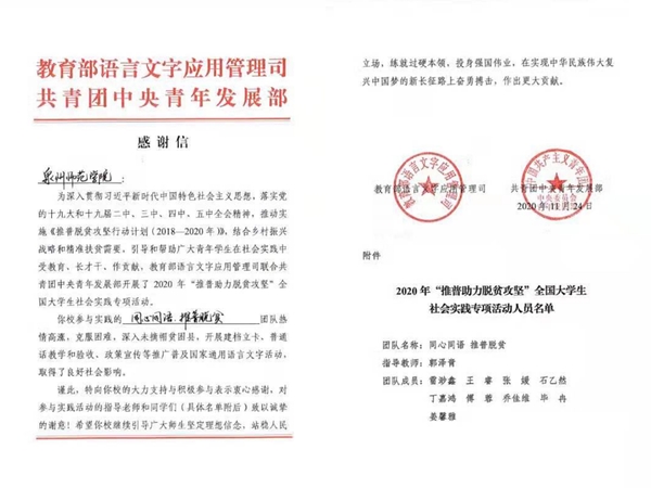 近日,教育部语言文字应用管理司、共青团中央青年发展部向我校发来感谢信,对我校师生在暑假期间赴甘肃省临夏回族自治州东乡族自治县考勒乡河西村开展“推普助力脱贫攻坚”全国大学生社会实践专项活动中的突出表现,表示了诚挚的谢意。
