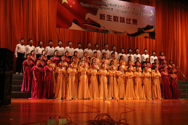 合唱团的同学们个个昂首挺胸,气宇轩昂。歌声由远及近,像从遥远的天边缓缓传来,轻抚耳膜又扩散开去,全场顿时一片寂静!一个声部接着一个声部,一浪接着一浪,此起彼伏,交汇成一股雄浑的音波,圆融丰满,绕梁不止。完美演绎了这首红色革命歌曲的磅礴气势,唱出了红色革命年代的奋斗精神。一首歌曲把观众带回了那个硝烟弥漫的年代,重现了祖辈们艰苦奋斗、面对强敌不屈不挠的伟大精神。唱完后台下发出一阵激烈的掌声。