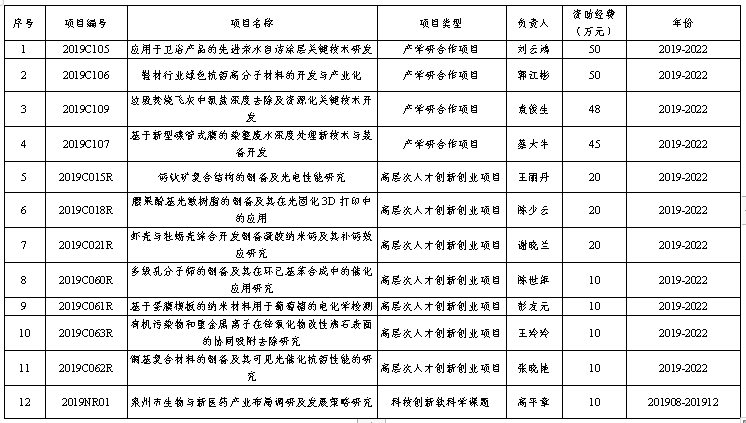 另根据《泉州市科技局关于公布2019年度泉州市第一批科技计划项目立项结果的通知》(泉科[2019]191号)和《泉州市科技局关于公布2019年度高层次人才创新创业项目补助经费的通知》(泉科[2019]229号)的文件通知,我院立项各类市级计划项目12项,占全校立项数量的50%;获批资助经费303万元,立项数量和资助经费上都位居全校第一。其中,产学研合作项目4项,获批经费193万元;高层次人才创新创业项目7项,获批经费100万元;科技创新软科学课题1项,获批经费10万元。