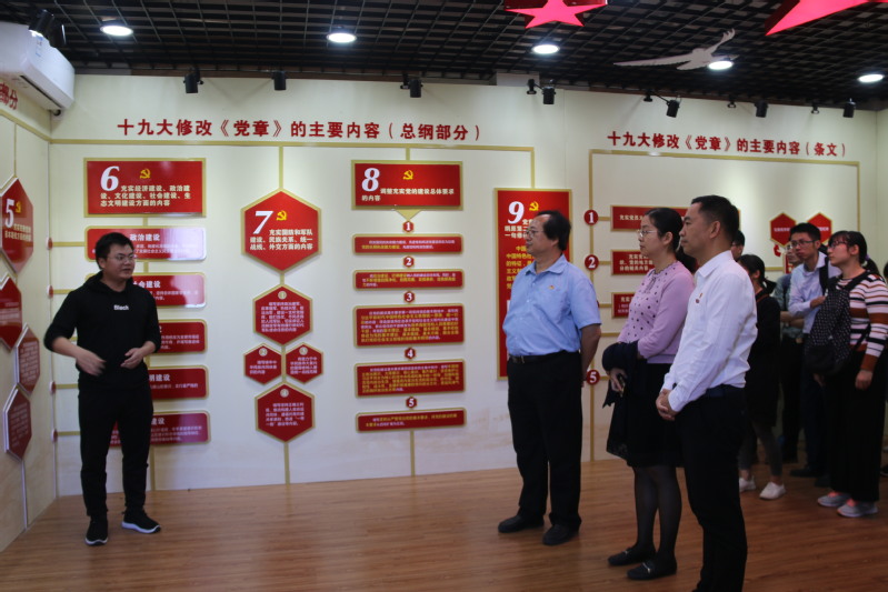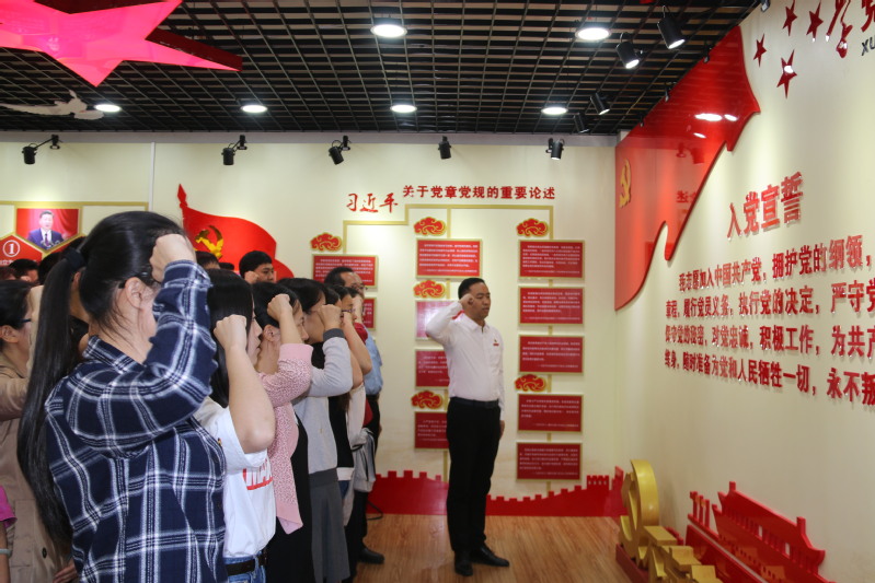 在党章教育馆,院党委书记傅志雄带领全体党员重温了入党誓词。随后,傅志雄还作了题为《加强政治建设,抓好党建促发展》的专题发言。