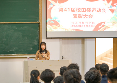 会上,林琦芳副书记向在本次校运会上取得名次的运动员,参与入场式方阵、广播操比赛、和排舞比赛的同学们表示祝贺。同时,她也向认真负责的学生会、自律会、青协志愿者、班级后勤保障同学表示由衷的感谢。她对化工师生在校运会上展现出的积极进取、和谐奋进的精神风貌表示肯定,并希望大家把本届校运会上表现出的竞争意识、自尊自信、拼搏向上和团结合作的精神发扬光大,融入今后的学习、生活之中,以饱满的热情、昂扬的斗志、拼搏的精神,实干的行动,共同推进化工与材料学院高质量发展。