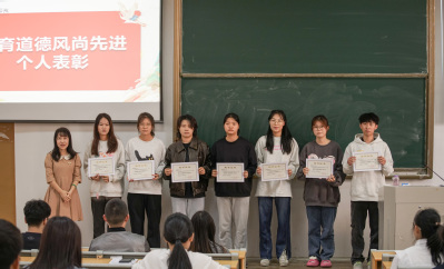然后,由副书记兼纪委书记林琦芳及5位辅导员分别对我院荣获体育道德风尚先进个人、学生先进集体、运动会先进个人进行颁奖,并合影留念。