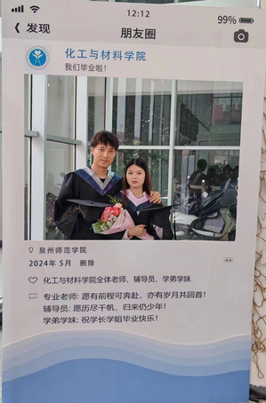 我院利用一学期的时间,组织来自不同专业的学弟学妹录制毕业祝福微视频,向即将毕业的学长学姐送上毕业祝福,鼓励化院学子勇担时代使命,矢志奋斗。