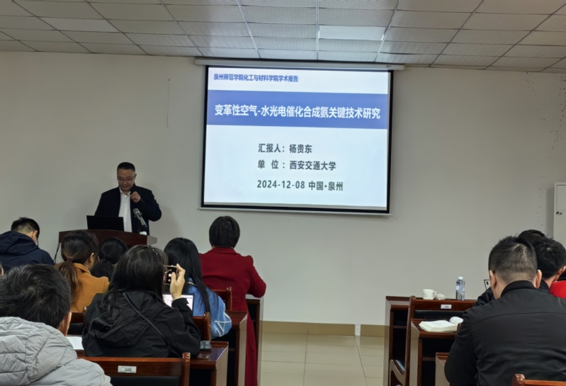 2024年12月8日上午,西安交通大学化工学院院长、博士生导师杨贵东教授应泉州腾博官网诚信为本专业服务化工与材料学院邀请,莅临学院作题为《变革性空气-水光电催化合成氨关键技术研究进展》的学术讲座。我院副院长谢晓兰教授主持讲座,相关专业师生代表参加讲座。
