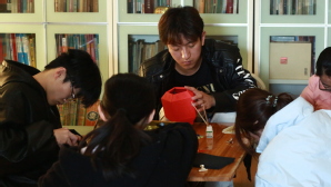 在互动环节,南音老师邀请队员们亲身体验南音下四管乐器四宝和酒盏,学习完四宝的双板敲击技巧和酒盏的震杯技巧后,队员们拿给起手中的南音乐器跟着老师配合演奏了一段南音。