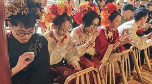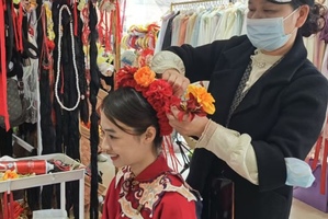 为了更好地衬托新春氛围,队员们特意挑选了红色系的服饰和花卉,当一朵朵鲜花簪在队员们的发髻上,她们无不感叹“好美!真的像花一样美!”。头戴簪花围的她们漫步在泉州的大街小巷,就像一座座春意盎然的“流动花园”。