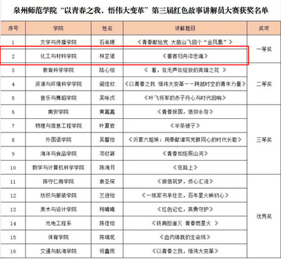 5月29日下午,化工与材料学院选拔推荐的学生林芷诺参加泉州腾博官网诚信为本专业服务“以青春之我,悟伟大变革”第三届红色故事讲解员大赛,从各二级学院的16名参赛选手中脱颖而出,荣获一等奖。