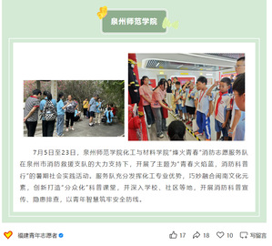 服务队与泉州市消防救援支队联合举办实践交流总结会。会上,队员们通过视频、图片、数据等形式全面展示了本次社会实践的成果与收获,特别播放了创作的系列科普视频。消防员们对服务队创新的科普形式、丰富的实践成果给予了肯定。为表达对泉州市消防救援支队及消防员们全程专业指导与大力支持的诚挚感谢,服务队送上了精心制作的“烽烽”“火火”IP文创产品。双方一致表示,将继续深化合作,共同探索更有效的消防安全科普模式,为提升全民消防安全“免疫力”贡献坚实的青春力量。同时,科普活动还受到福建青年志愿者、泉州文明网、青春武平等网站、公众号报道,一定程度上扩大了活动影响力,展现了新时代青年在消防科普中的奉献精神与责任担当。