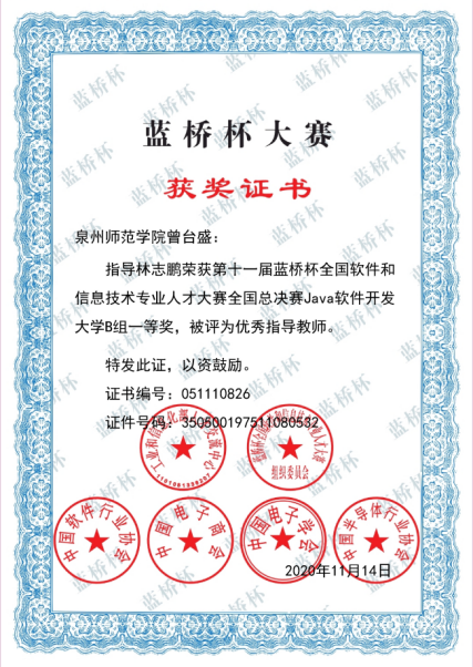 福建省高校优秀共产党员,泉州市计算机类专业优秀教育工作者,泉州市第三层次高层次人才。研究方向为图像检索、无线传感器网络、大数据,主持参与福建省高校服务海西建设重点项目《无线传感器网络技术及其在环境监测与防灾减灾中的应用》、《南音工尺谱打谱软件设计研究》等科研项目20多项,科研经费200多万,发表论文三十余篇,其中SCIEI收录十余篇。组织、带领学生参加全国、省大学生程序设计类竞赛获得国家级奖项30多项,省级120多项。国家级一流本科课程线上线下课程《高级语言程序设计》负责人,主讲的《数据结构》课程先后获评福建省精品课程、福建省精品在线开放课程、福建省线上一流课程,主讲的《编译原理》课程获评福建省线下一流课程。